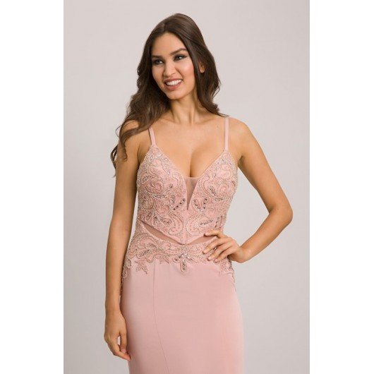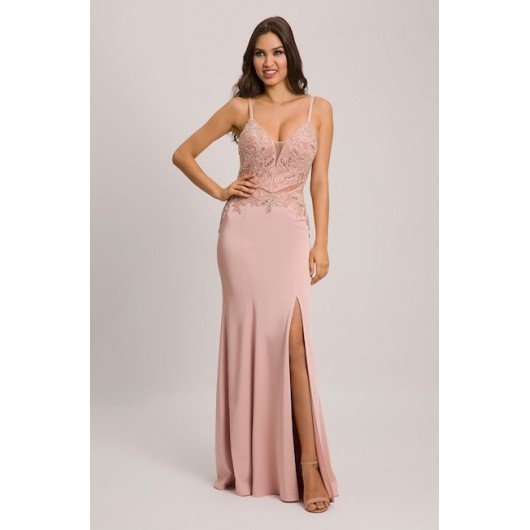 Vestido longo blush rosê, alça fina, com meio corpo bordado à mão e fenda.