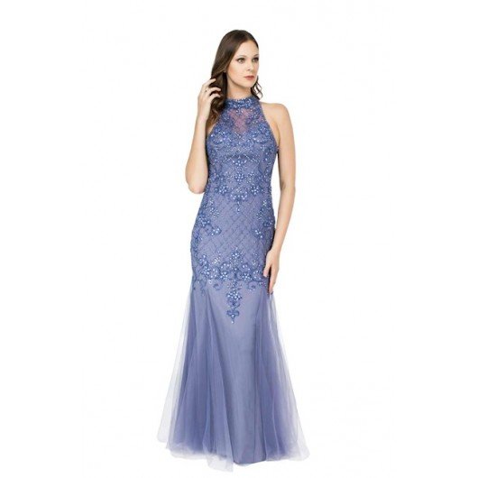 Vestido longo lilas sereia todo bordado com decote nas costas.