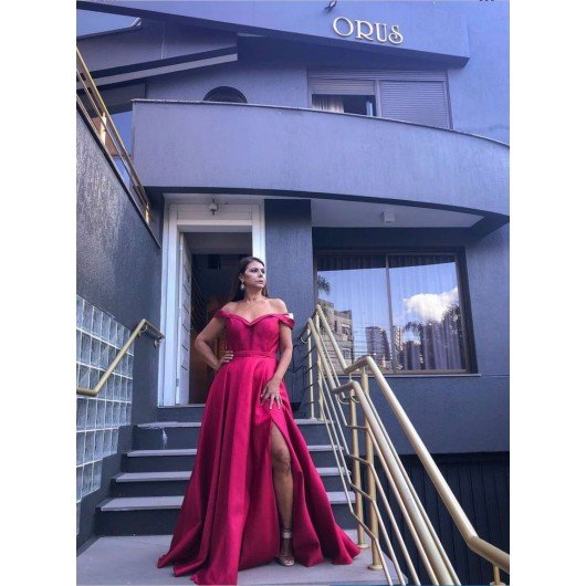 Vestido Longo Marsala de Zibeline, manga caída e fenda.