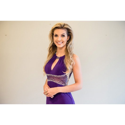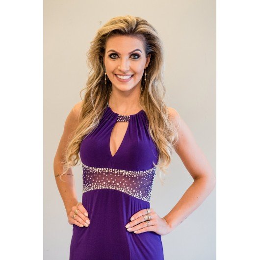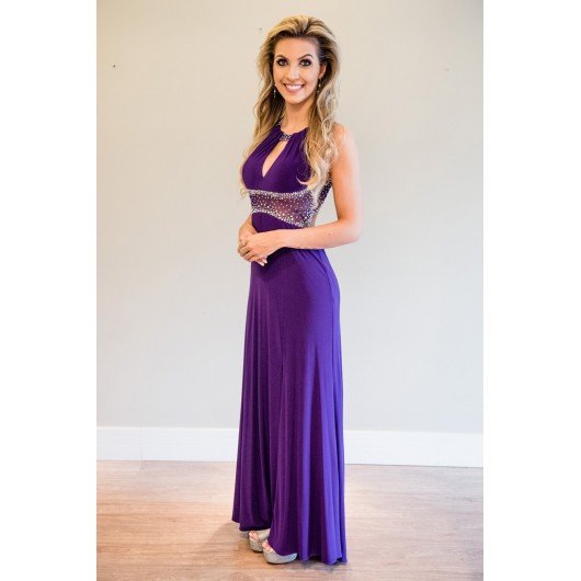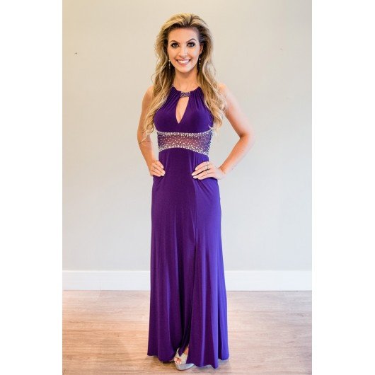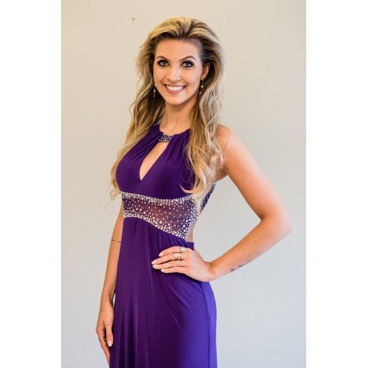 Vestido longo violeta com bordados em cristais swarovski e decote em gota com costas abertas.
